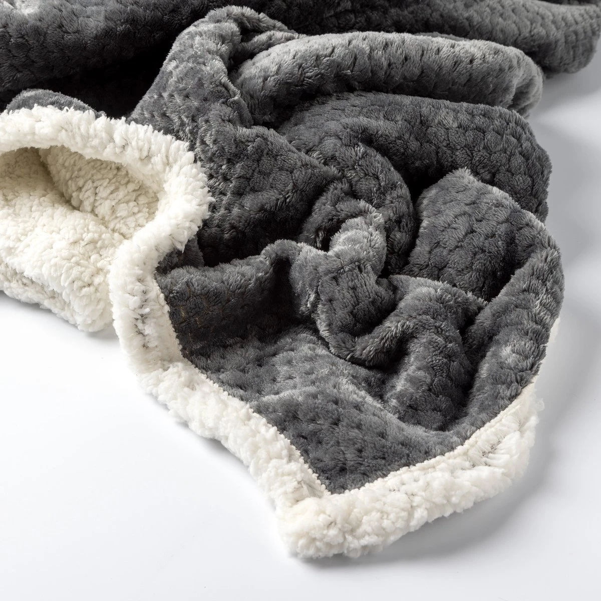 Plaid Cody is een zacht en warm! De ene kant heeft een witte teddy stof en de andere kant is antraciet. Deze kleuren passen binnen ieder interieur. Dankzij het extra grote formaat van 150×200 cm is het plaid te gebruiken voor twee personen of als een sprei voor op bed.