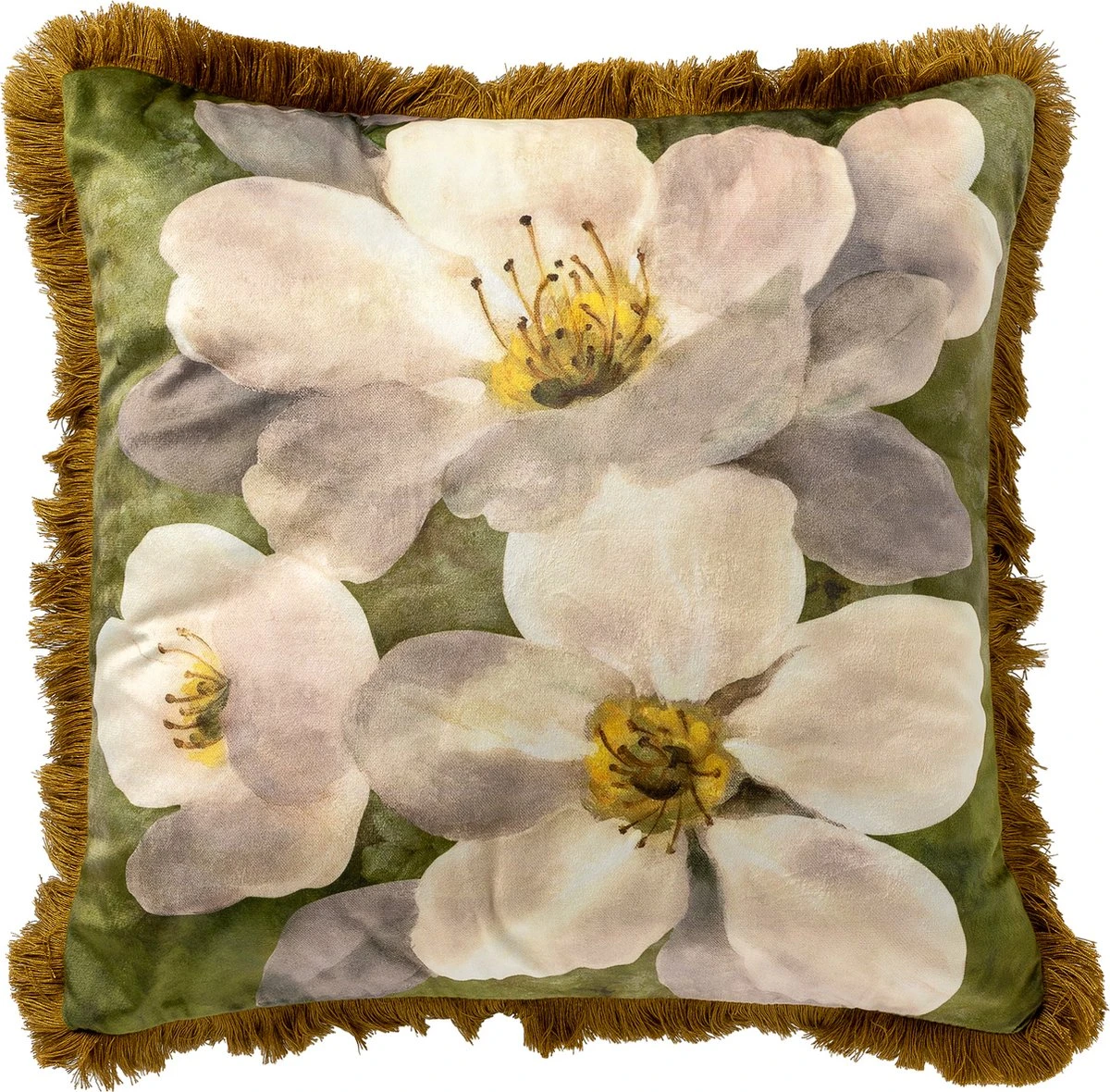 Kussenhoes Nena heeft een opvallende bloemenprint en een goudkleurige franjerand. Deze kussenhoes met afmeting 45×45 cm in de kleur Olive Branch is voorzien van een rits. Het kussenhoesje is gemakkelijk te vullen met een standaard 45×45 cm binnenkussen. Met de kussenhoezen van Dutch Decor kun je eindeloos combineren.